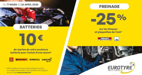 Il y a toujours une promo pneu intéressante avec Eurotyre ! Pneus pas cher pour un budget serré, cadeau exclusif, remboursement… notre réseau de garagistes tisse des partenariats avec les plus grandes marques.
